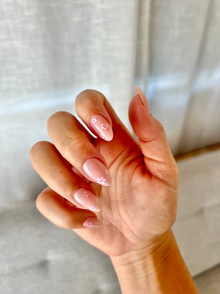 Soft, delicate, and effortlessly feminine. Blossom features a sheer blush pink base with tiny floral details for a fresh, everyday look. Designed for those who love subtle beauty, this set is perfect if you want your nails to feel polished without being bold or overdone.